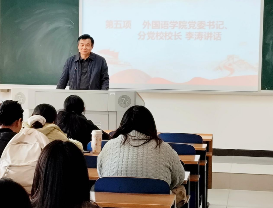 典礼第五项,李涛代表学院党委致词,他首先祝贺全体学员顺利结业,肯定大家培训期间的良好表现。同时他结合青年成长特点,提出八点殷切希望:一是坚定信仰明方向,指出青年人要以革命先辈为榜样,通过学习党的创新理论筑牢信仰之基;二是树立理想担使命,强调把个人的理想追求融入党和国家事业之中,外语学习者要讲好中国故事,推动中华文化更好走向世界;三是厚植家国情怀守初心,将心系天下、投身报国的豪迈气概转化成笃定的爱国之志和忠诚的爱国之行;四是涵养正气修品格,青年人要严守纪律规矩,锤炼高尚道德情操;五是昂扬奋斗显担当,摒弃“躺平”心态,在学习工作中迎难而上;六是体悟人生增阅历,在实践中积累经验、丰富人生厚度;七是勇立潮头敢创新,紧跟时代步伐,展现青年活力风采;八是争做时代新青年,以“四炼”强本领,“四情”谱新篇,投身到实现中华民族伟大复兴的中国梦的伟大实践中去。